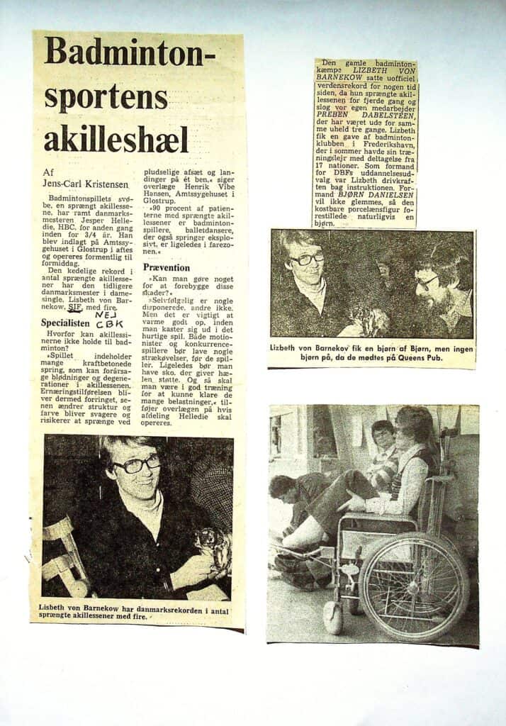Og så skal det lige med, at Lisbeth von Barnekow har danmarksrekorden – og måske verdensrekorden, i sprængte akillessener ved badmintonspil. Hele fire gange måtte Lisbeth konstatere, at akillessenen ikke holdt, og at hun måtte igennem lange genoptræningsforløb for at kunne svinge ketsjeren igen.