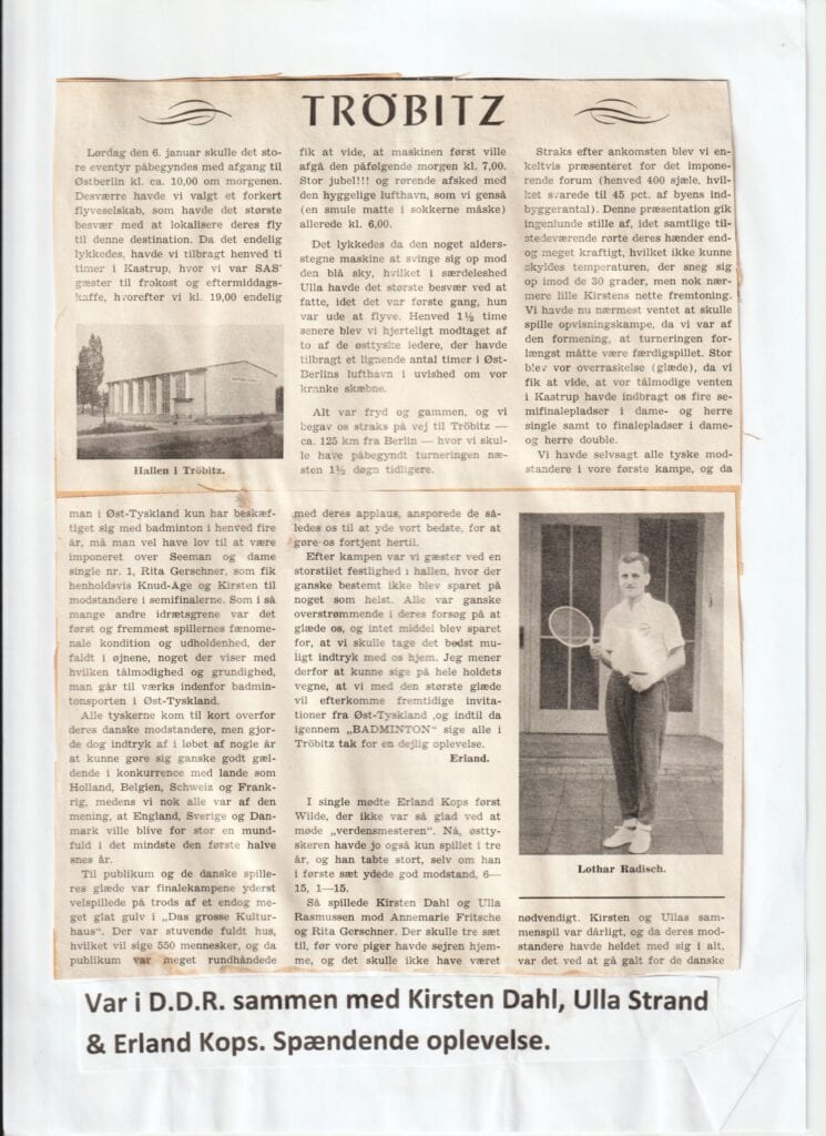 Venskabet med spillere fra Danmark startede i begyndelsen 1960’erne, hvor badmintontræneren Emil Rasmussen fra HBC (”Miller”) tidligere havde været på besøg med spillere som Erland Kops, Knud Aage Nielsen, Kirsten Dahl (Kjærbye) og Ulla Rasmussen (Strand) m.fl. Her spillede man opvisningskampe, da østtyskerne i denne lille by var meget interesserede.